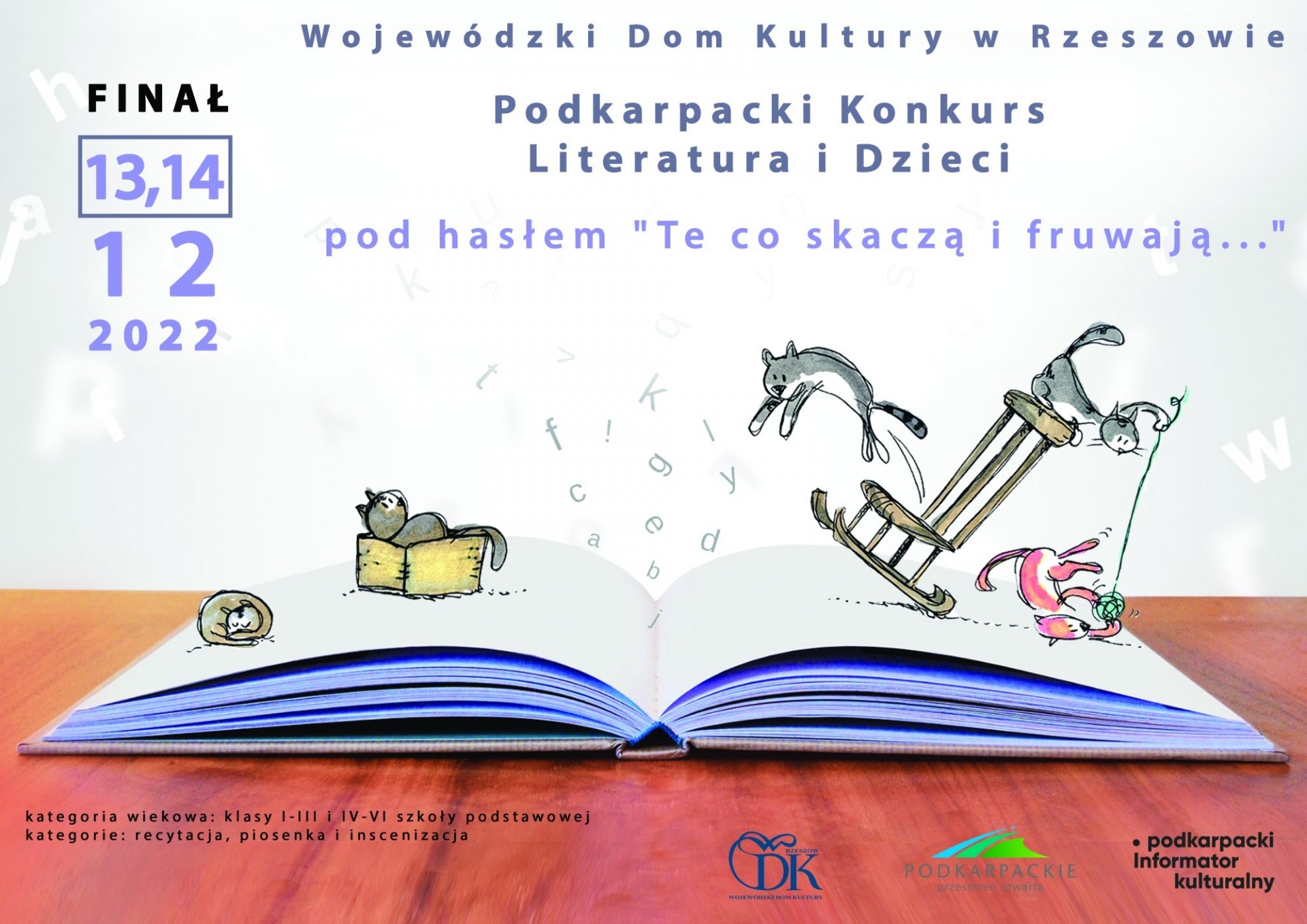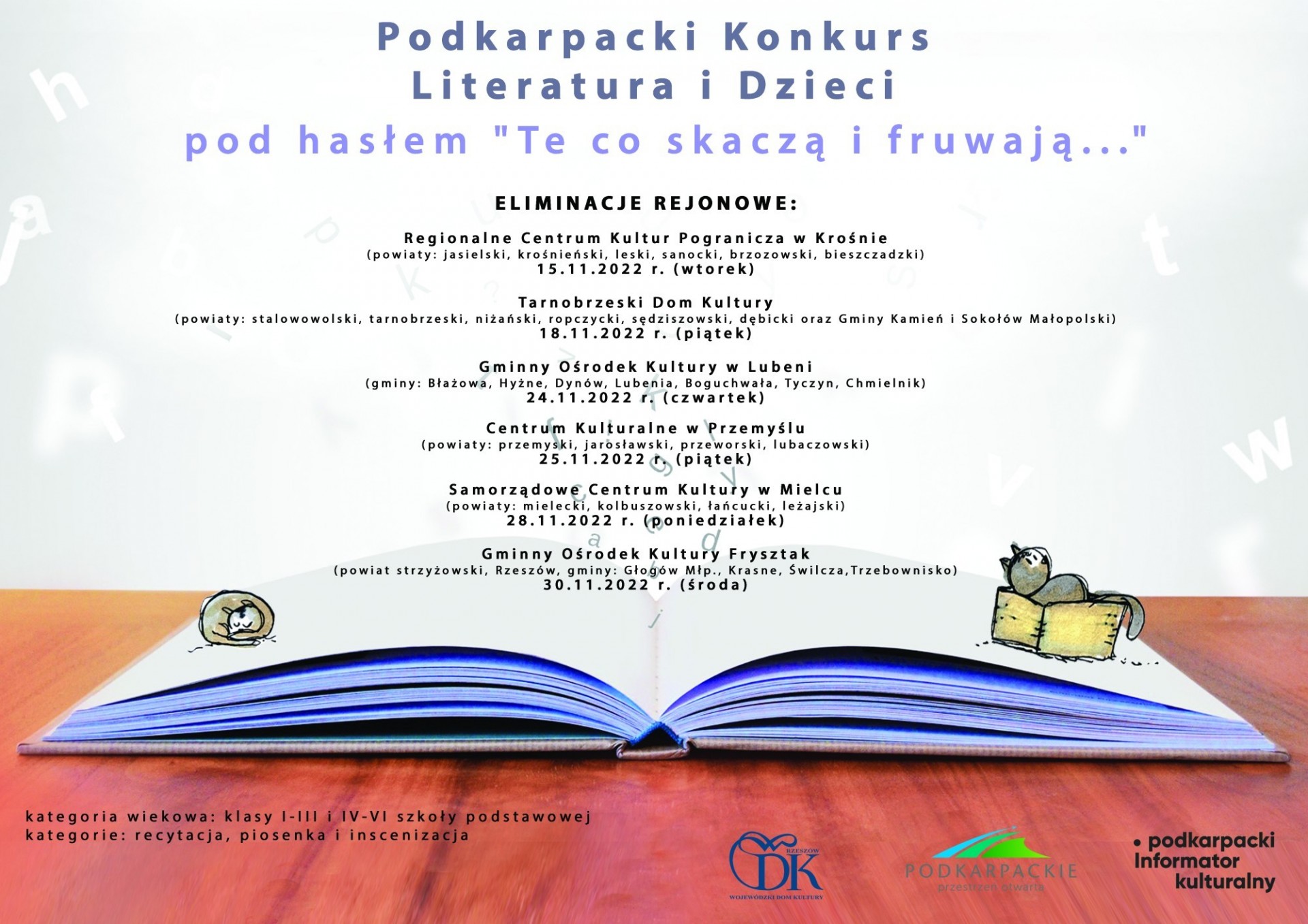 Wojewódzki Dom Kultury w Rzeszowie powraca z konkursem „Literatura i dzieci”. Mogą wziąć w nim udział uczniowie szkół podstawowych z klas 1 – 6. Konkurs będzie rozgrywany w dwóch grupach wiekowych: klasy 1 – 3 i 4 – 6 oraz w kategoriach: recytacja, piosenka i inscenizacja. Tegoroczny temat brzmi: „Te co skaczą i fruwają...".