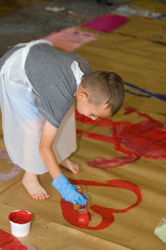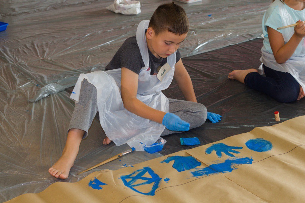 Dnia 13 sierpnia odbyły się zajęcia rysunkowo-malarskie XXL. Niestety pogoda w tym dniu nie dopisała, więc zajęcia planowane w plenerze odbyły się ostatecznie w sali widowiskowej mieszczącej się w Urzędzie Gminy. Przygotowana wielkoformatowa płaszczyzna w postaci papieru pozwoliła dzieciom pracować z ogromnym rozmachem i twórczą swobodą. Wspólna praca artystyczna sprzyjała integracji ponad 30 osobowej grupy. Młodzi twórcy mogli posługiwać się różnymi technikami, począwszy od rysunku ołówkiem czy kredką, a skończywszy na malowaniu farbami wykorzystując różnorodne narzędzia (pędzle, wałek malarski, korki do odciskania wzorów itp.). Większy format pracy pomógł uczestnikom spojrzeć w odmienny sposób na tworzenie obrazów czy rysunku. Podczas zajęć nie obyło się też bez pomalowania nóg, twarzy, czy włosów, ale mamy nadzieję, że rodzice podeszli ze zrozumieniem do tej sytuacji.