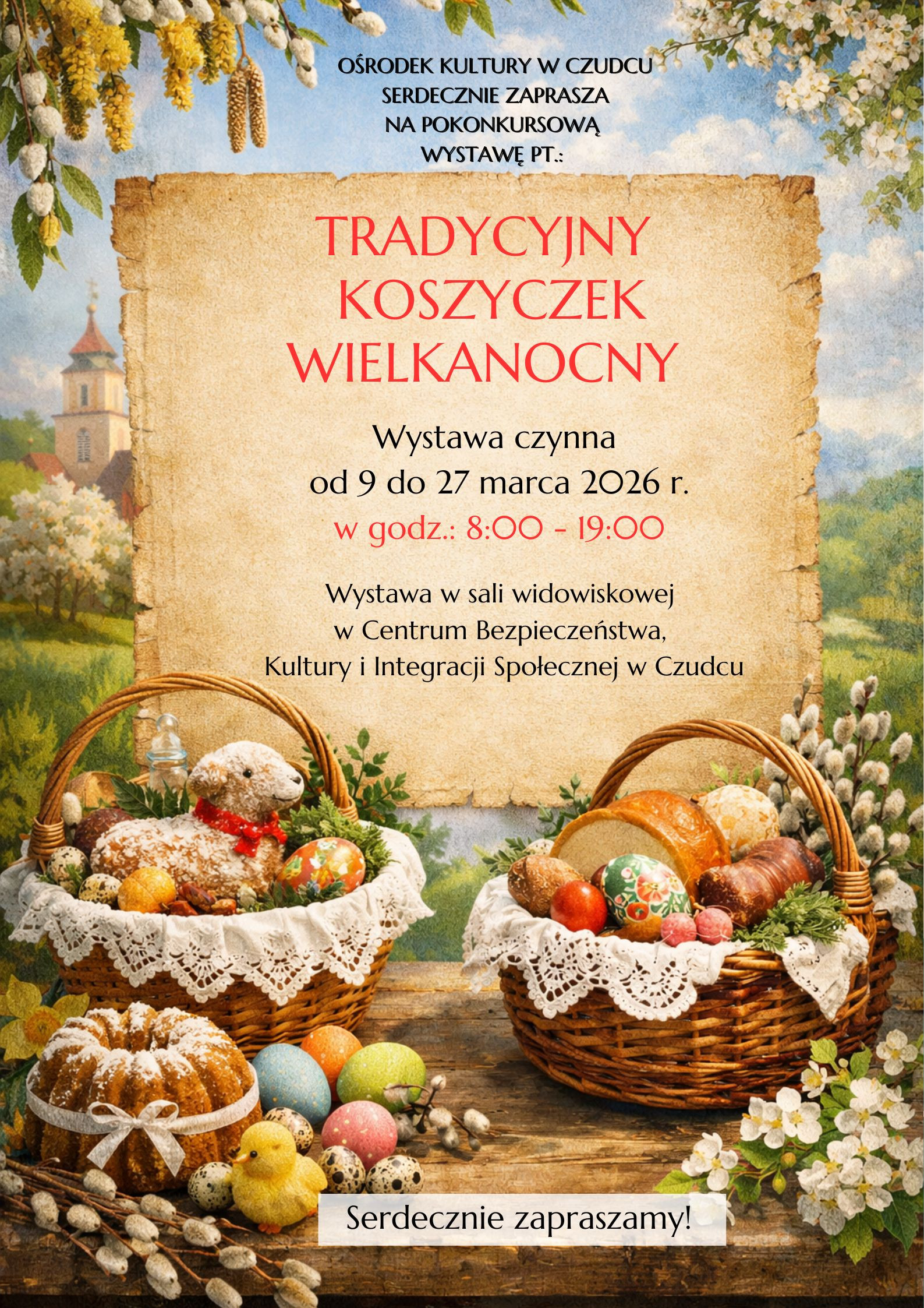 W dniach od 9 do 27 marca 2026 roku w sali widowiskowej Centrum Bezpieczeństwa, Kultury i Integracji Społecznej w Czudcu dostępna była pokonkursowa wystawa pt. „Tradycyjny Koszyczek Wielkanocny”. Na wystawie zaprezentowano różnorodne, tradycyjnie przygotowane koszyczki wielkanocne, ukazujące bogactwo lokalnych zwyczajów i dekoracji związanych ze świętami Wielkanocy. Wydarzenie cieszyło się zainteresowaniem mieszkańców oraz stanowiło okazję do kultywowania i promowania regionalnych tradycji.