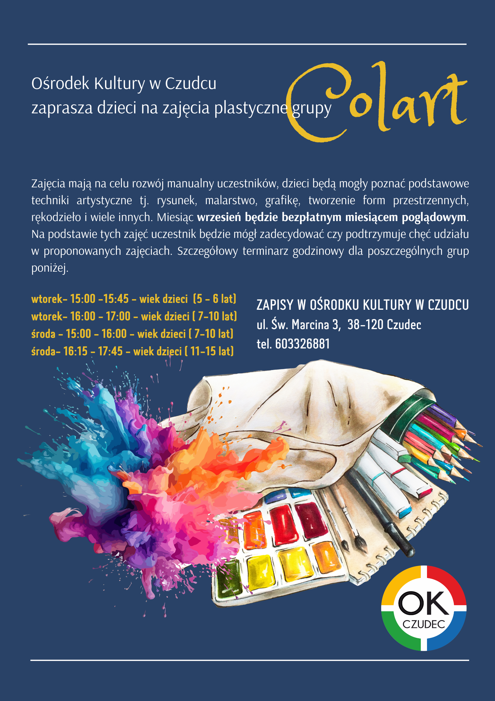 Celem zajęć jest rozbudzanie zainteresowań sztuką oraz rozwijanie uzdolnień artystycznych. Uczestnicy zajęć plastycznych mają możliwość poznania różnych technik plastycznych z dziedziny malarstwa, rysunku, grafiki itp.